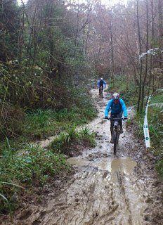 De ahí un pequeño tramo de carretera para enlazar nuevamente con monte puro, donde disfrutamos como enanos, por unas trialeras brutales, auténticas trampas de barro, y todo ello serpenteando entre árboles. Hubo un tramo que bajamos por un riachuelo bastante caudaloso que nos sirvió para limpiar la bici, pero la limpieza nos duró poco, ya que los tramos de mucho barro fueron muchos.